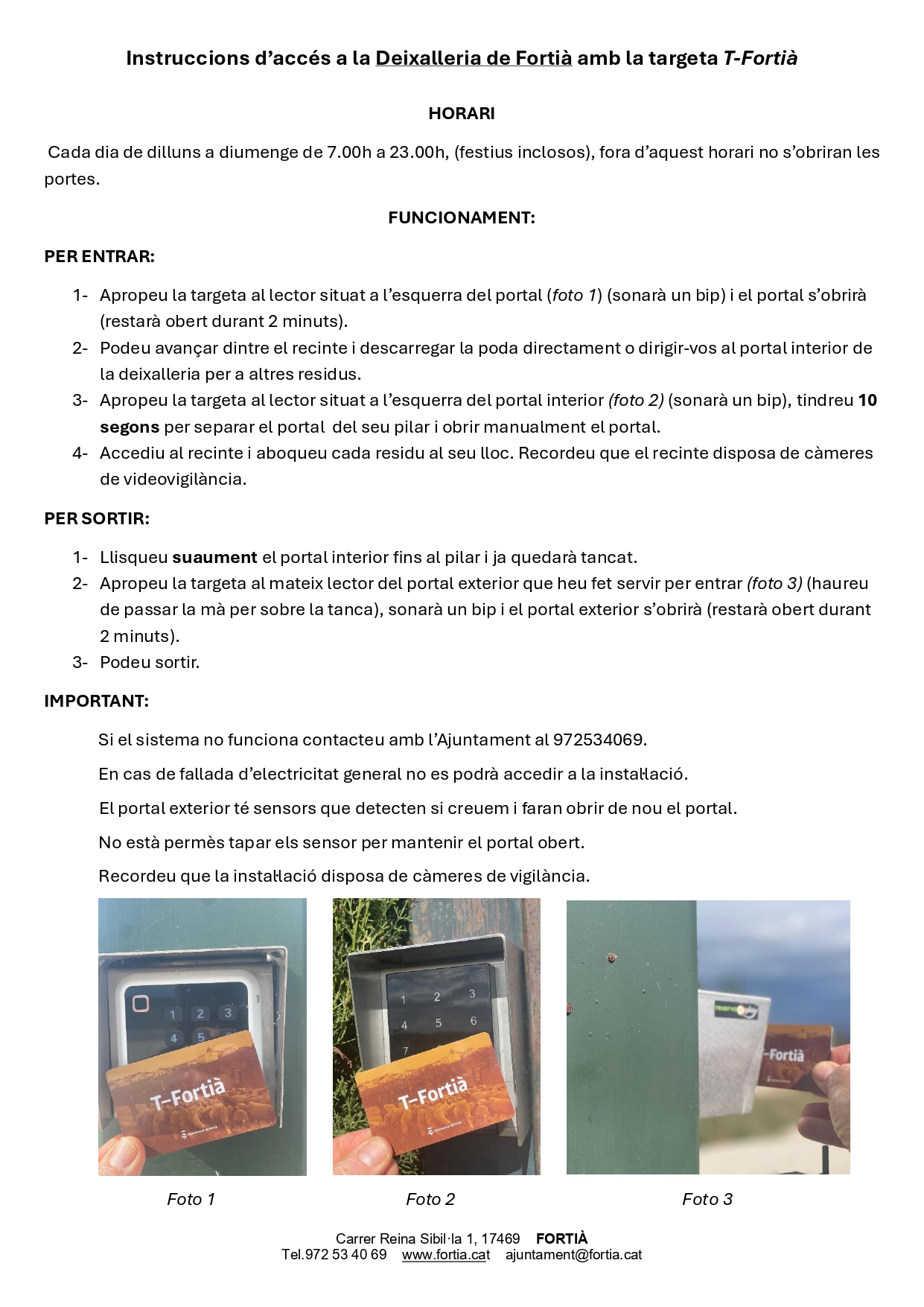 Per ús de la deixalleria fora de l’horari establert amb la tageta “T-Fortià” seguiu les instruccions següents: