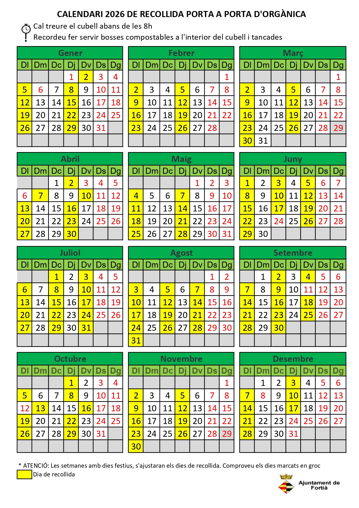 Les setmanes amb dies festiu quedaran alterats els dies de recollida, consulteu el calendari anual més avall pels dies de recollida (marcats en groc).
